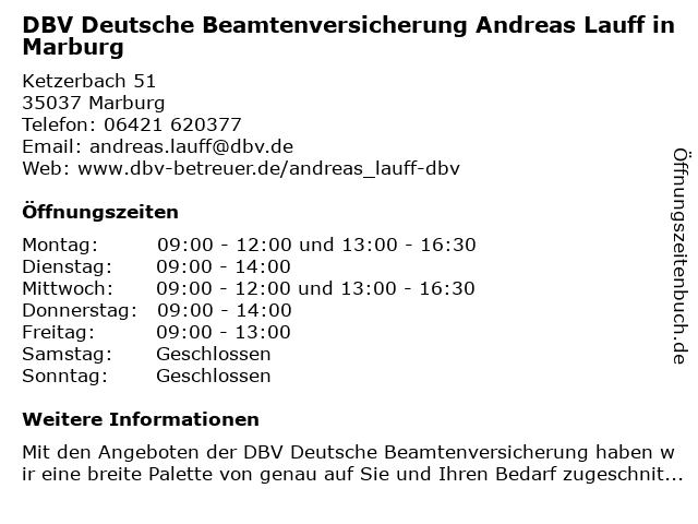 2 DBV Deutsche Beamtenversicherung Krüper & Döll oHG in Marburg (Entfernung: 0,80 km) Universitätsstraße 15, 35037 Marburg 3 DBV Deutsche Beamtenversicherung Sascha Borde Lohra (Entfernung: 17,61 km) Am Heilborn 3a, 35102 Lohra 6 |