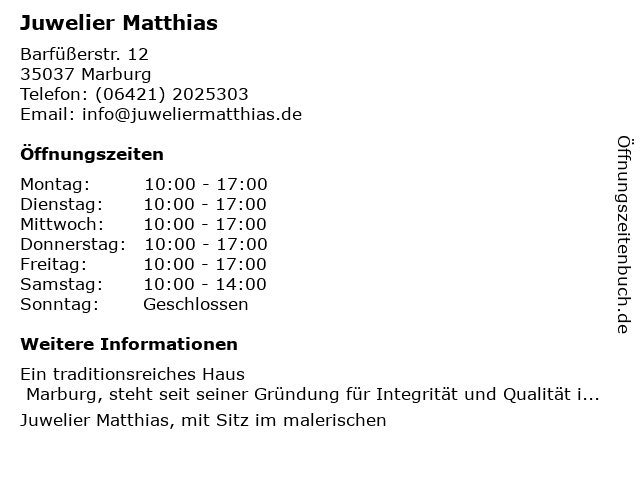 | Öffnungszeiten Juwelier Matthias in Marburg anzeigen | |