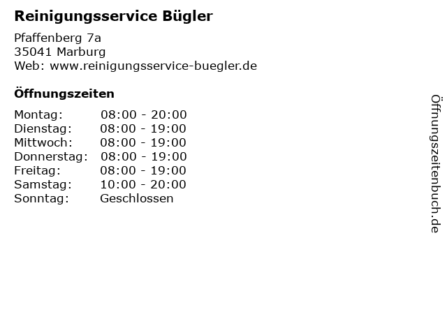 | Öffnungszeiten Reinigungsservice Bügler in Marburg anzeigen | |