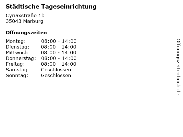 | Öffnungszeiten Städtische Tageseinrichtung in Marburg anzeigen | |