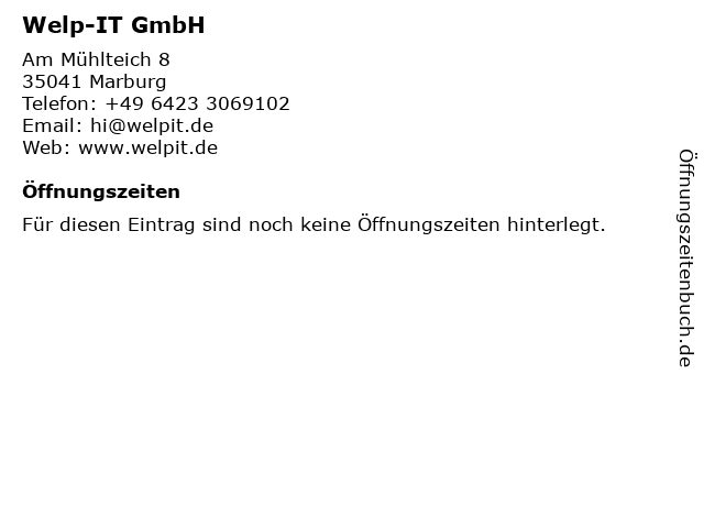 | Öffnungszeiten Welp-IT GmbH in Marburg anzeigen | |