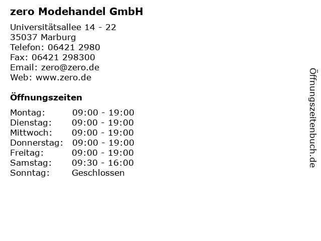 | Öffnungszeiten zero Modehandel GmbH in Marburg anzeigen | |