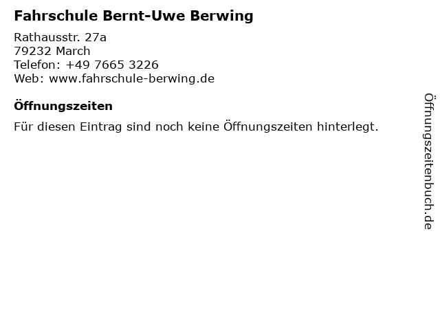 | Öffnungszeiten Fahrschule Bernt-Uwe Berwing in March anzeigen | |