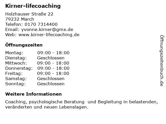 | Öffnungszeiten Kirner-lifecoaching in March anzeigen | |