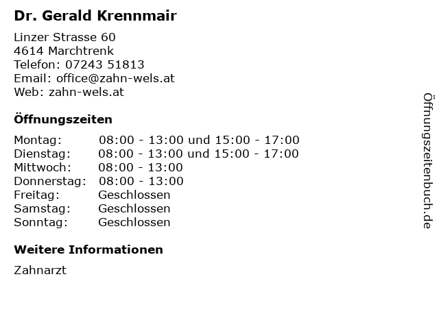| Öffnungszeiten Dr. Gerald Krennmair in Marchtrenk anzeigen | |