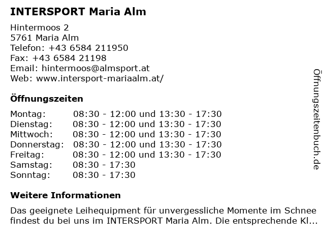 | Öffnungszeiten INTERSPORT Maria Alm in Maria Alm anzeigen | |