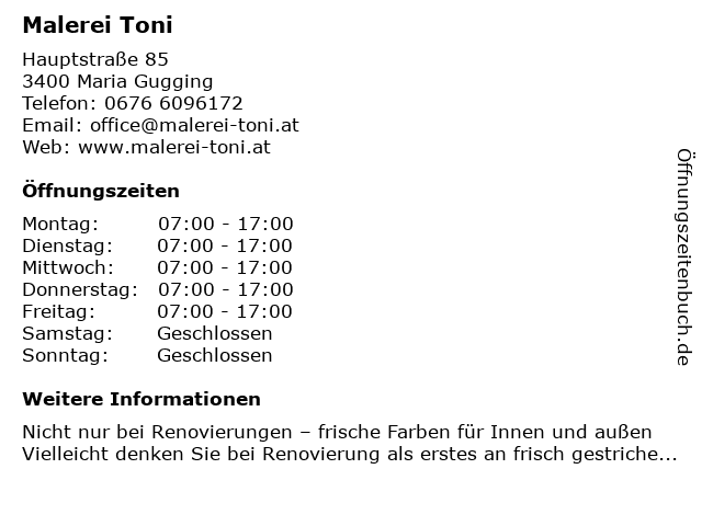 | Öffnungszeiten Malerei Toni in Maria Gugging anzeigen | |