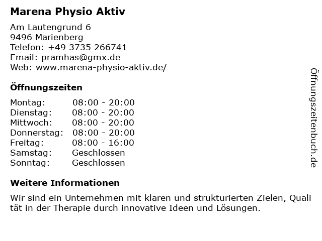 | Öffnungszeiten Marena Physio Aktiv in Marienberg anzeigen | |