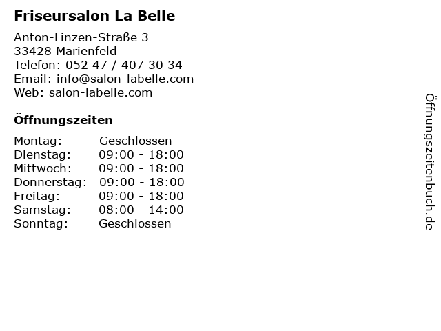 | Öffnungszeiten Friseursalon La Belle in Marienfeld anzeigen | |