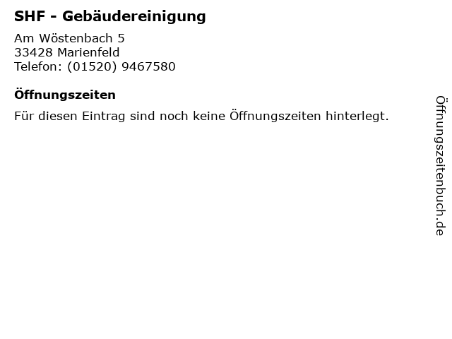 | Öffnungszeiten SHF - Gebäudereinigung in Marienfeld anzeigen | |