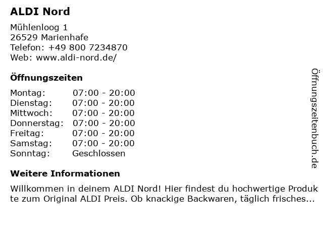 | Öffnungszeiten ALDI Nord in Marienhafe anzeigen | |