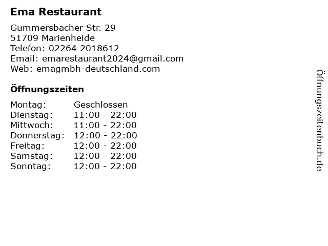 | Öffnungszeiten Ema Restaurant in Marienheide anzeigen | |