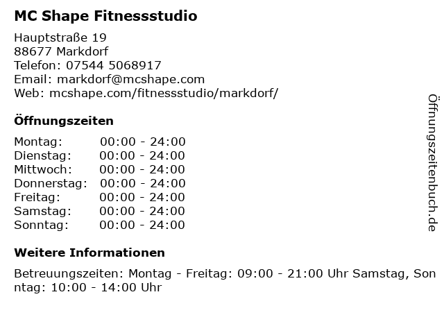 | Öffnungszeiten MC Shape Fitnessstudio in Markdorf anzeigen | |