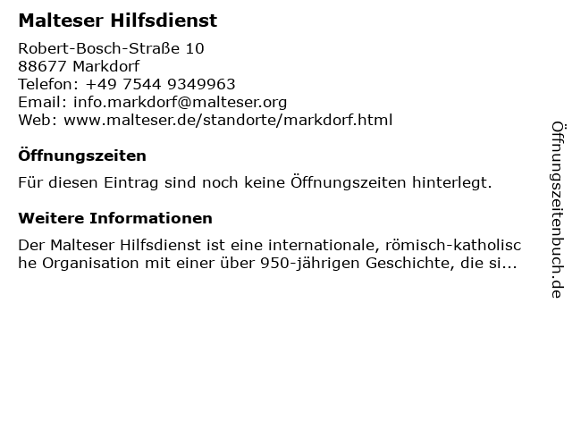 | Öffnungszeiten Malteser Hilfsdienst in Markdorf anzeigen | |