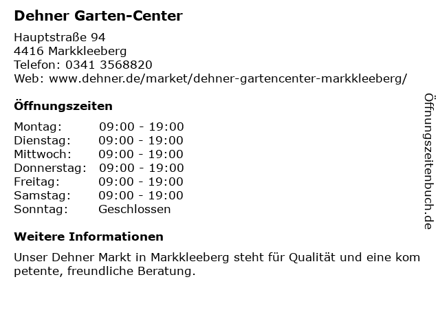 | Öffnungszeiten Dehner Garten-Center in Markkleeberg anzeigen | |