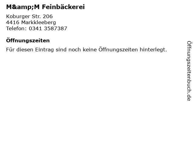 | Öffnungszeiten M&M Feinbäckerei in Markkleeberg anzeigen | |