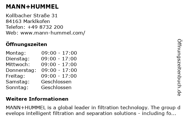| Öffnungszeiten MANN+HUMMEL in Marklkofen anzeigen | |