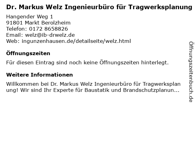 | Dr. Markus Welz Ingenieurbüro für Tragwerksplanung anrufen | |