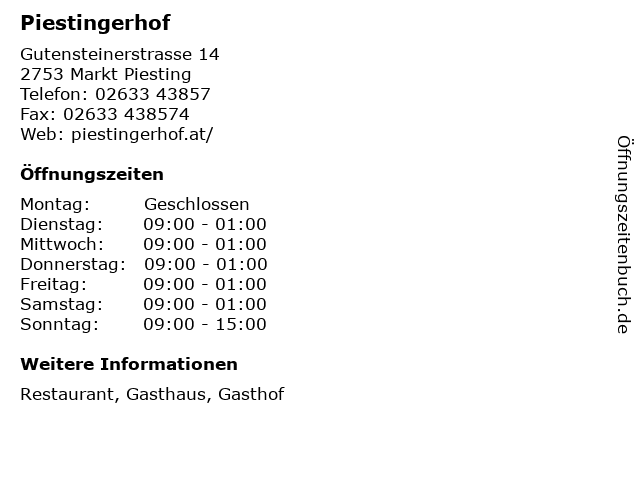 | Öffnungszeiten Piestingerhof in Markt Piesting anzeigen | |