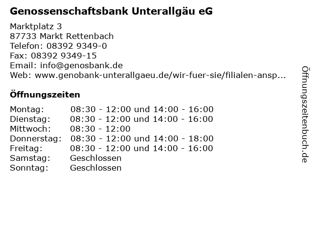 6 Genossenschaftsbank Unterallgäu eG (Geldautomat) (Entfernung: 0,01 km) Marktplatz 3, 87733 Markt Rettenbach |