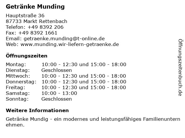 | Öffnungszeiten Getränke Munding in Markt Rettenbach anzeigen | |