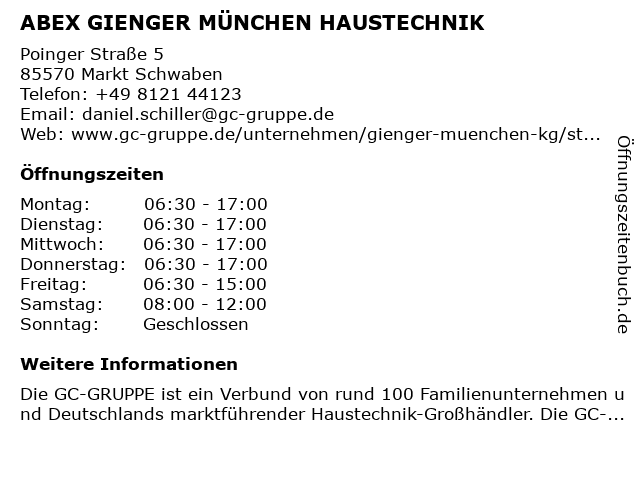 5 ABEX GIENGER MÜNCHEN HAUSTECHNIK (Entfernung: 17,06 km) Münchener Straße 55, 85567 Grafing bei München 6 |