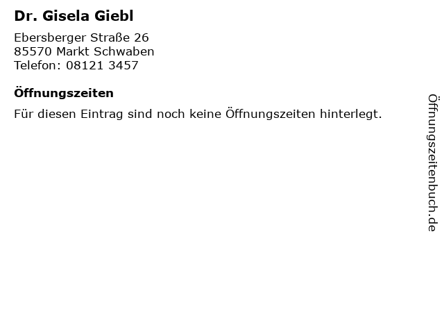 | Öffnungszeiten Dr. Gisela Giebl in Markt Schwaben anzeigen | |