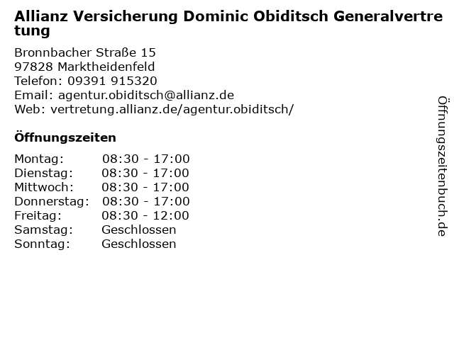1 Allianz Versicherung Marius Väth e.K. Generalvertretung (Entfernung: 0,00 km) Bronnbacher Straße 15, 97828 Marktheidenfeld 2 Allianz Versicherung Richard Oswald Generalvertretung (Entfernung: 0,20 km) Echterstraße 13, 97828 Marktheidenfeld 3 Allianz Versicherung Tim Jodlowski Generalvertretung (Entfernung: 11,14 km) Bahnhofstraße 21, 97877 Wertheim 4 Allianz Versicherung - Generalvertretung Jörg Kopejsko (Entfernung: 11,46 km) Hospitalstr. 8, 97877 Wertheim 6 Allianz Versicherung Sebastian Inderwies Generalvertretung (Entfernung: 17,07 km) Bahnhofstraße 2, 97816 Lohr am Main |