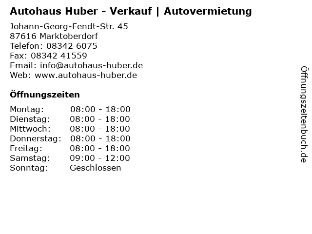 1 Autohaus Huber - Werkstatt und Teileverkauf (Entfernung: 0,00 km) Johann-Georg-Fendt-Str. 45, 87616 Marktoberdorf 3 Deutsche Vermögensberatung (Dvag), Sigrun Huber (Entfernung: 12,28 km) Neugablonzer Str. 37, 87600 Kaufbeuren 6 |