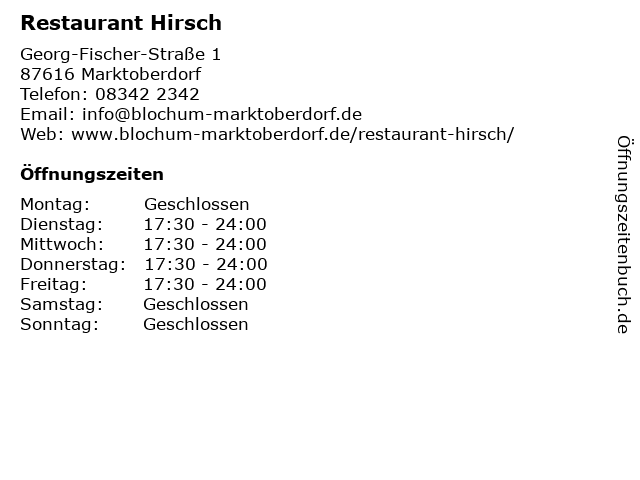 | Öffnungszeiten Restaurant Hirsch in Marktoberdorf anzeigen | |