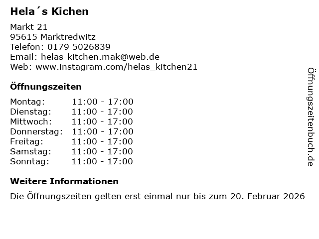| Öffnungszeiten Hela´s Kichen in Marktredwitz anzeigen | |