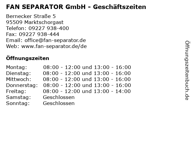 Branchen & Suchbegriffe zu FAN SEPARATOR GmbH - Geschäftszeiten:fan, geschäftszeiten, ingenieurbüro, separator |