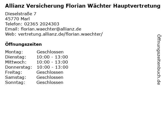 4 Markus Schulz Architekt, Immobilienwirt u. Sachvertändiger f. Immobilien (Entfernung: 1,25 km) Emslandstr. 34, 45770 Marl 6 Allianz Versicherung Andreas König e.K. Hauptvertretung (Entfernung: 1,36 km) Trogemannstraße 9, 45772 Marl |