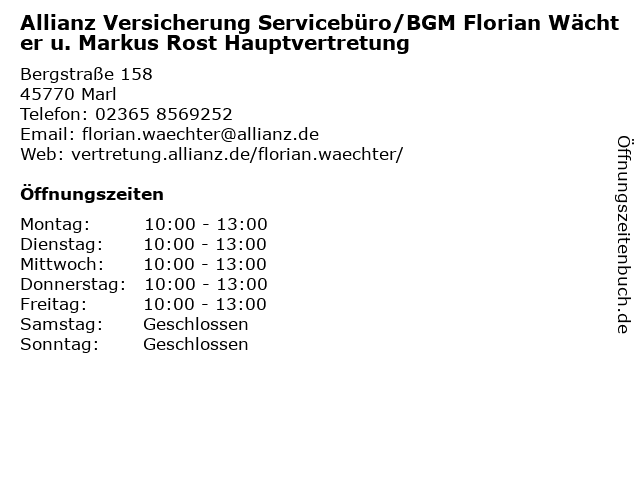 4 Markus Schulz Architekt, Immobilienwirt u. Sachvertändiger f. Immobilien (Entfernung: 1,25 km) Emslandstr. 34, 45770 Marl 6 Allianz Versicherung Andreas König e.K. Hauptvertretung (Entfernung: 1,36 km) Trogemannstraße 9, 45772 Marl |