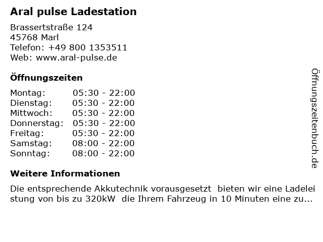 | Öffnungszeiten Aral pulse Ladestation in Marl anzeigen | |