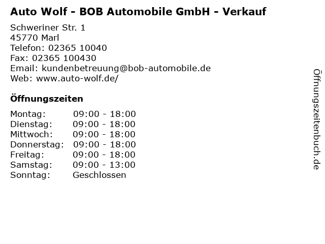 1 Autohaus Wolf - BOB Automobile GmbH - Ersatzteile & Zubehör (Entfernung: 0,00 km) Schweriner Str. 1, 45770 Marl 3 Taxi - Taxi Wolf Inh. Ralf Rudowski u. Stefan Schulden oHG (Entfernung: 1,39 km) Goethestr. 8, 45768 Marl 5 Bob & Son GmbH - Vertrieb und Reparatur von Golfschlägern (Entfernung: 12,42 km) Gahlener Straße 44, 46244 Bottrop 6 |