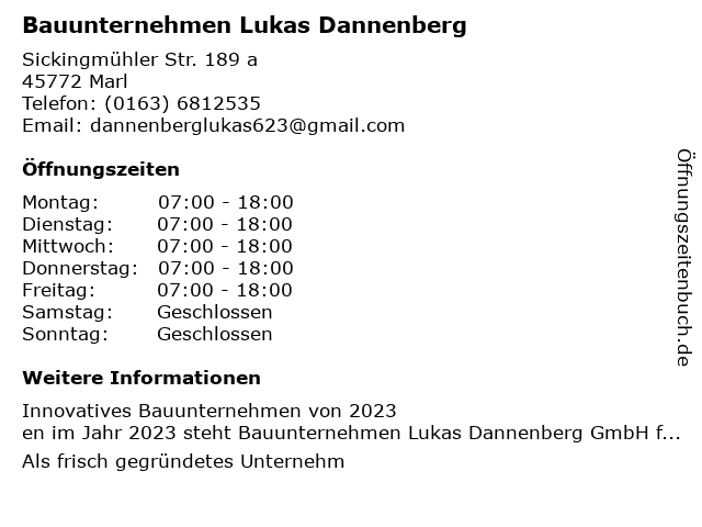 | Öffnungszeiten Bauunternehmen Lukas Dannenberg in Marl anzeigen | |