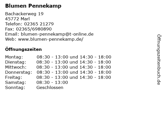| Öffnungszeiten Blumen Pennekamp in Marl anzeigen | |