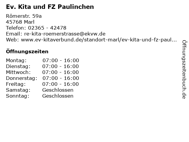 | Öffnungszeiten Ev. Kita und FZ Paulinchen in Marl anzeigen | |