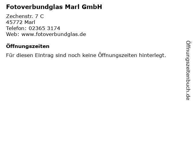 | Öffnungszeiten Fotoverbundglas Marl GmbH in Marl anzeigen | |