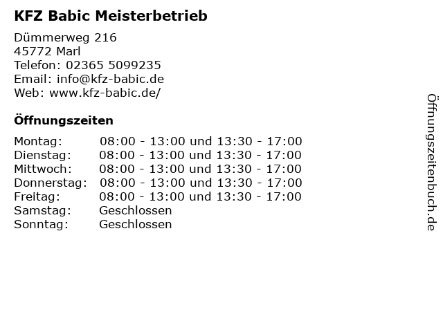 | Öffnungszeiten KFZ Babic Meisterbetrieb in Marl anzeigen | |