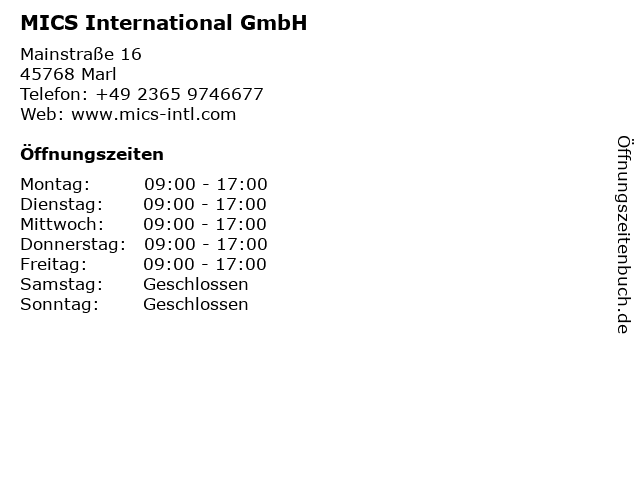 | Öffnungszeiten MICS International GmbH in Marl anzeigen | |