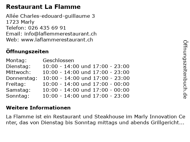 | Öffnungszeiten Restaurant La Flamme in Marly anzeigen | |