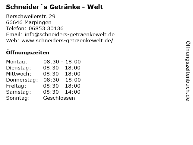 | Öffnungszeiten Schneider´s Getränke - Welt in Marpingen anzeigen | |