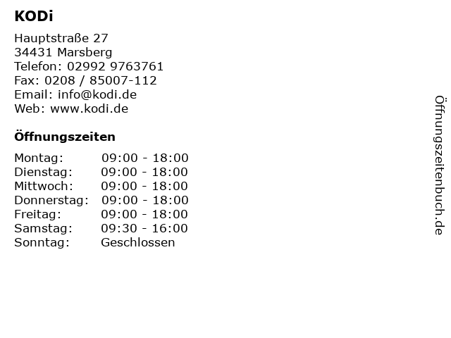 | Öffnungszeiten KODi in Marsberg anzeigen | |