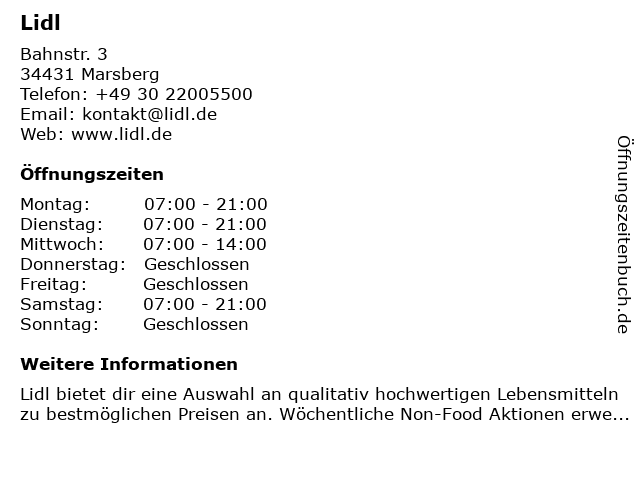 | Öffnungszeiten Lidl in Marsberg anzeigen | |