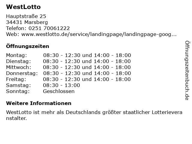 | Öffnungszeiten WestLotto in Marsberg anzeigen | |