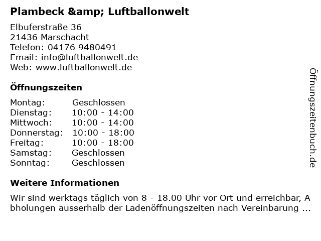 | Öffnungszeiten Plambeck & Luftballonwelt in Marschacht anzeigen | |