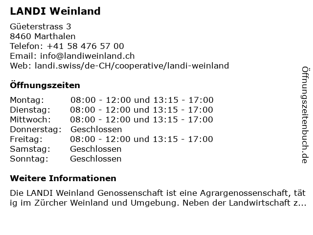 | Öffnungszeiten LANDI Weinland in Marthalen anzeigen | |