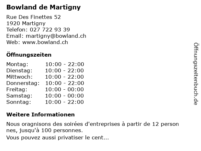 | Öffnungszeiten Bowland de Martigny in Martigny anzeigen | |